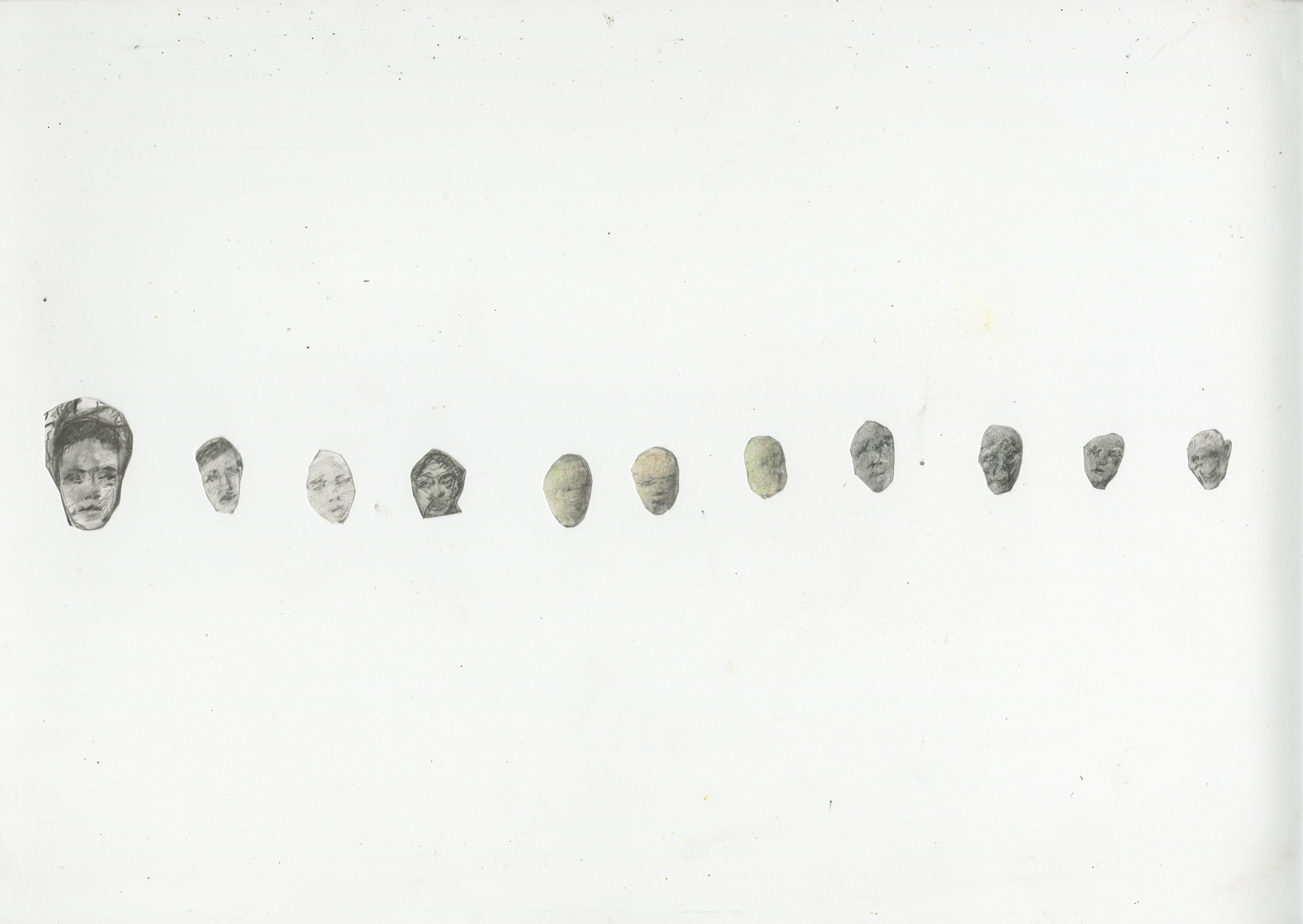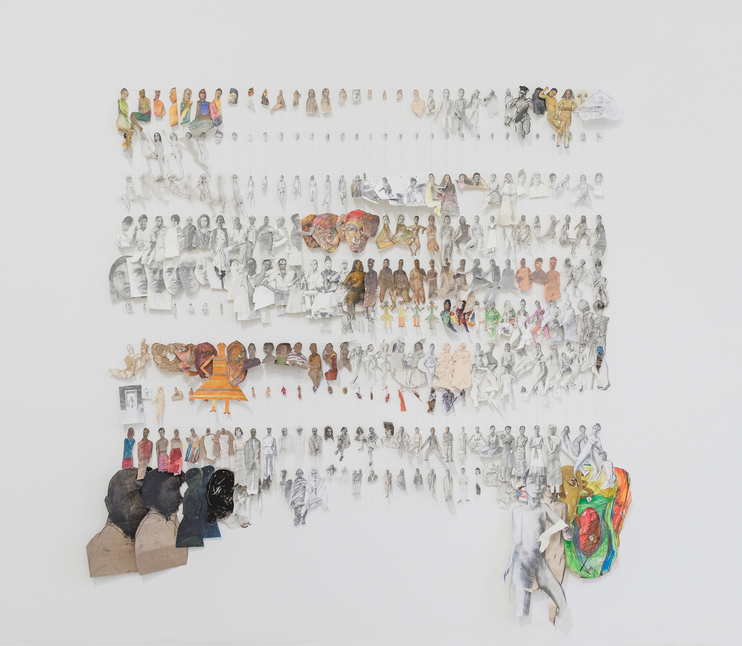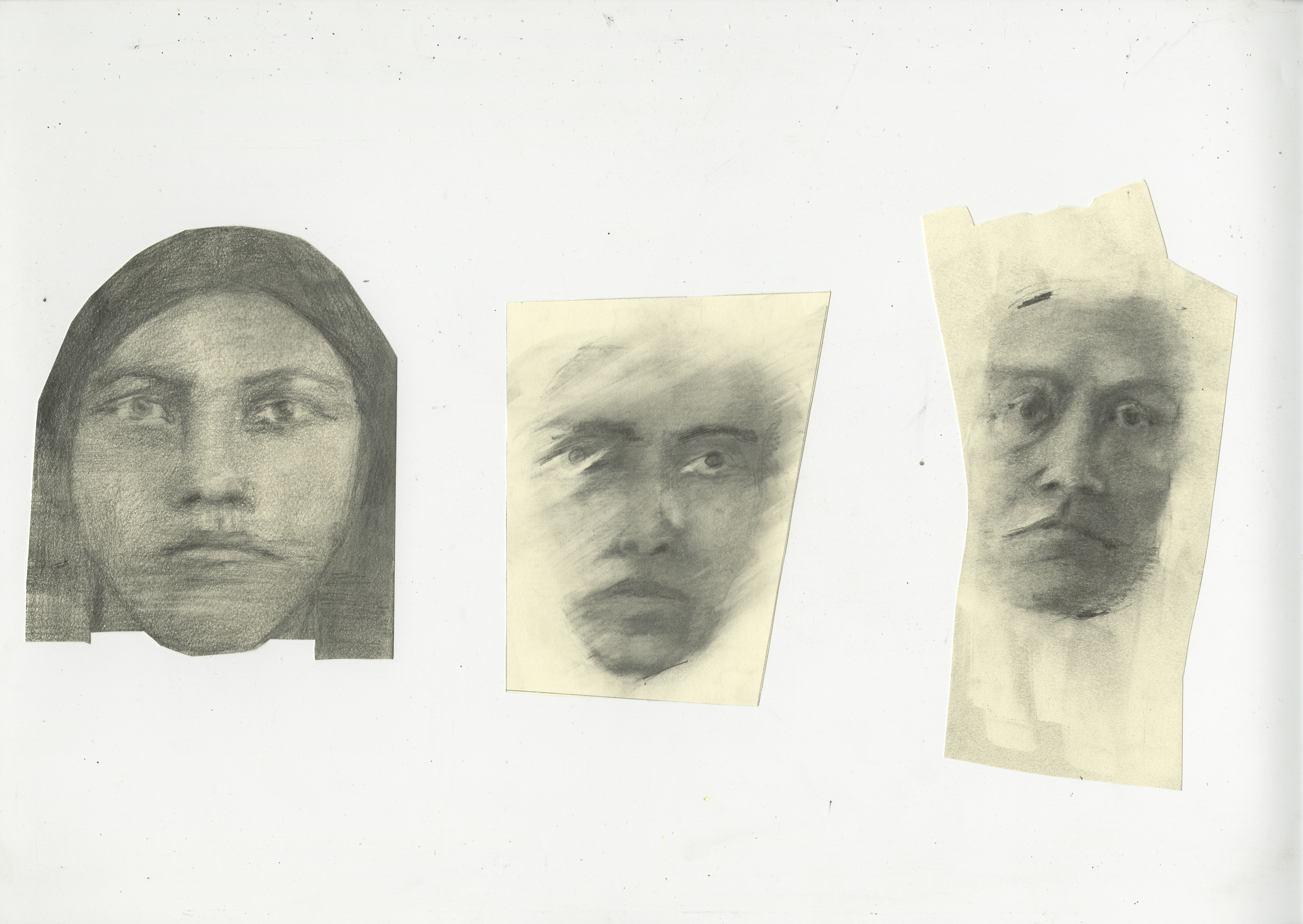 Having realized that I unconsciously draw figures whose skin tone is lighter than my own, I set out to retrain my hand and eye. Each note represents an attempt to draw a brown figure. Some are studies from photographs. Others are invented. The piece as a whole represents a self-determined ritual to end this intimate aspect of my internalized oppression. Pictured below are the three hundred and twenty notes, installed in the proportions of a Mayan ceremonial cloth, in the Minneapolis College of Art Design Gallery.